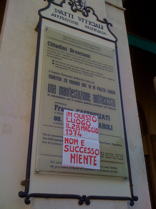 […] Sarfatti. Bondi e Pompei che crolla. Tutti quelli assolti per la strage di Brescia e quella fotografia scattata in piazza della Loggia di quel manifestino che diceva: “In questo luogo il 28 maggio […]