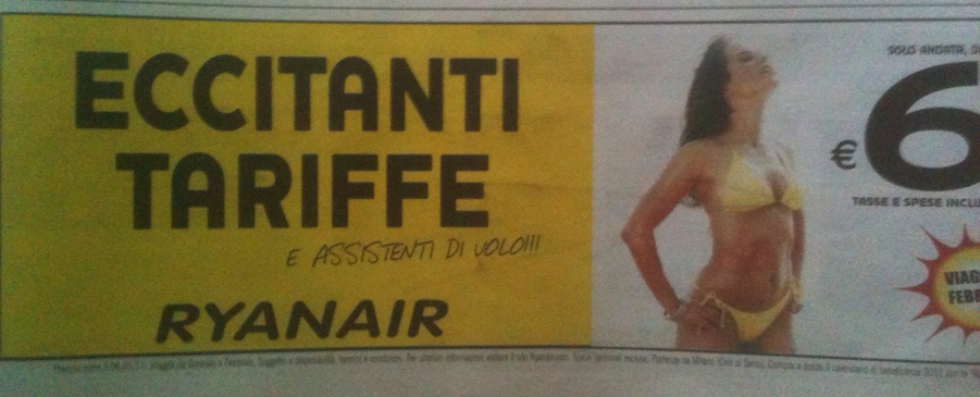 Il marketing di Ryan Air è famoso per aver sempre cercato di creare casi e polemiche. Eccoli di nuovo all’azione. Con l’annuncio qui sotto stanno prendendosi gioco del sessismo degli italiani, ciò che ormai tutto il mondo pensa di noi, e non mi stupirei che lo dimostrerassero col silenzio che accoglierà questo annuncio rispetto al cataclisma che una pubblicità del genere provocherebbe in qualsiasi altro paese d’Europa.