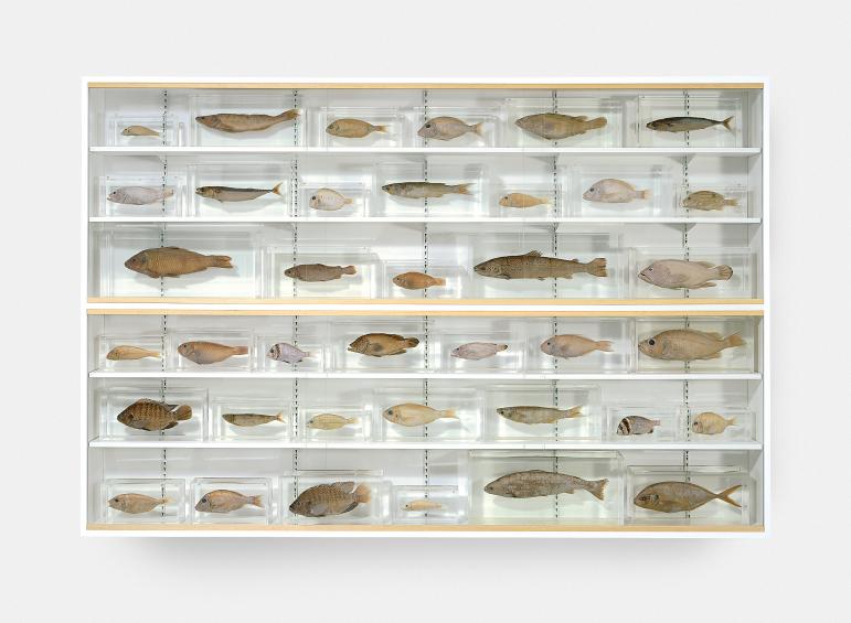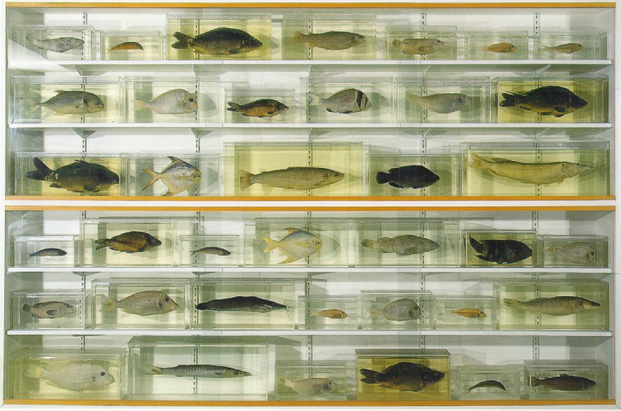 Le due installazioni che vedete qui sotto sono, nello stile di Hirst, fatte con pesci veri conservati in formaldeide e si chiamano “Elements Swimming in the Same Direction for the Purpose of Understanding (Left) and (Right)” e cioè “Elementi che nuotano nella stessa direzione per cercare di capire (sinistra) e (destra)”.