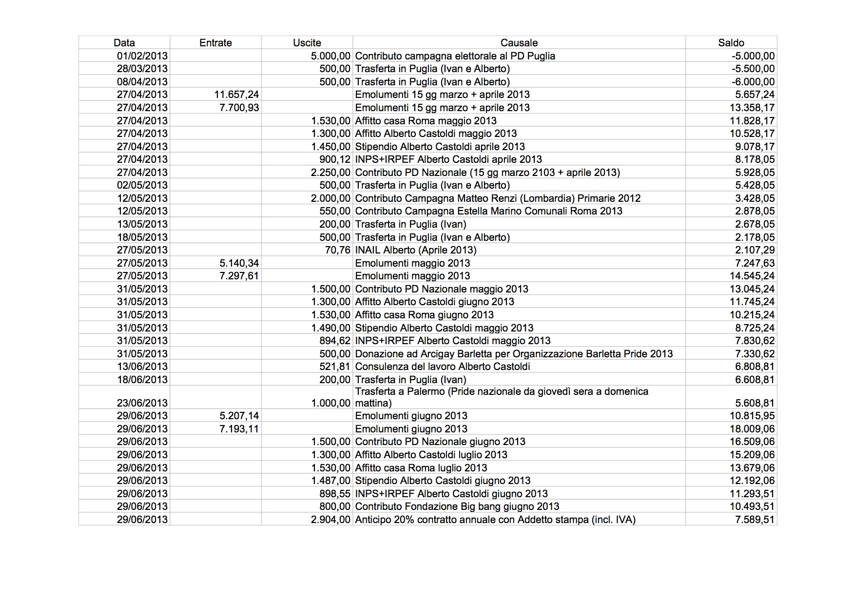 Quinto punto. Pago ogni mese 1.500 euro al Pd. Da questo mese di giugno, contribuisco con 800 euro mensili anche alla Fondazione Big bang. A maggio ho anche versato 2.000 euro al Comitato lombardo che ha sostenuto Renzi alla primarie, per aiutare a pagare spese risalenti alla campagna dello scorso autunno.