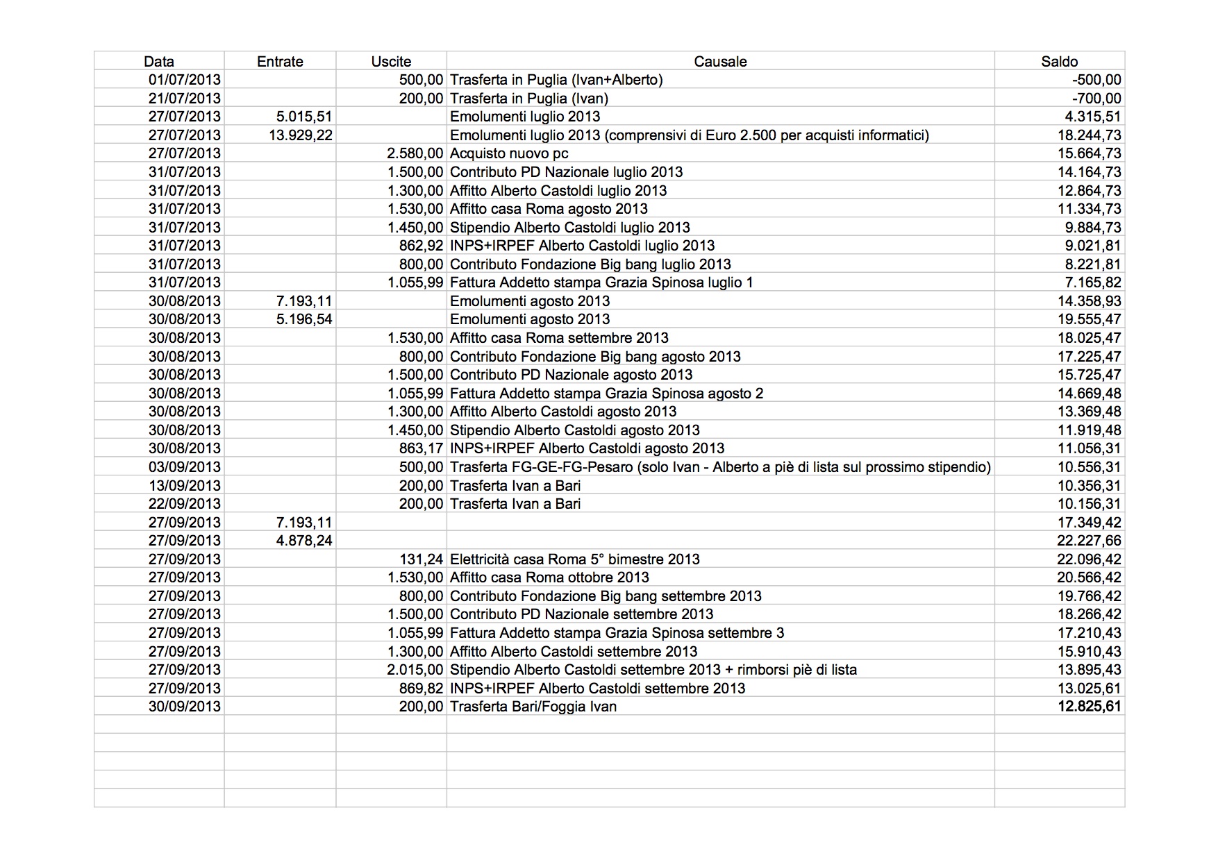2. La retribuzione dei miei collaboratori è già stata spiegata nel dettaglio nel post dello scorso trimestre. L’unica novità rispetto all’ultima volta è che le spese di Alberto per i viaggi, a far tempo da settembre, anziché essere sostenute da me, sono anticipate da lui e rimborsate sul suo cedolino a piè di lista.