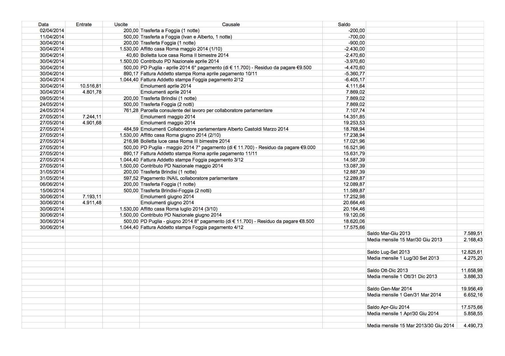 Spese particolari a mio carico per questo trimestre: la parcella del consulente del lavoro per l’elaborazione dei cedolini stipendio del mio collaboratore parlamentare, un’ultima tranche di pagamento del suo stipendio a mio carico (pre-nomina), il pagamento dell’assicurazione obbligatoria dell’INAIL. Poi, le solite spese di casa (affitto e bollette), i pagamenti mensili al partito nazionale e regionale, i viaggi verso il collegio elettorale in Puglia, le fatture pagate per l’addetto stampa a Roma e in Puglia.