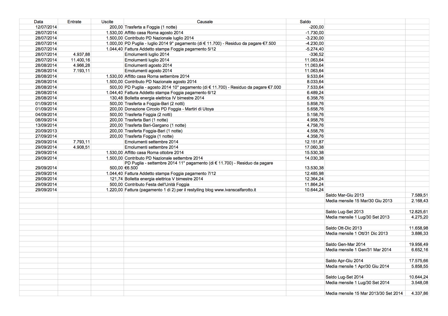 Spese particolari di questo trimestre un contributo speciale al PD di Foggia per la locale festa de L’Unità (ho versato metà dei mille euro che mi sono stati richiesti, l’altra metà la verserò il mese prossimo) e al circolo del PD cittadino per far fronte alle spese di affitto dei locali. Ho inoltre pagato la prima fattura (di due) per l’aggiornamento di questo blog che necessita di alcuni interventi tecnici, oltre che di una radicale revisione grafica.