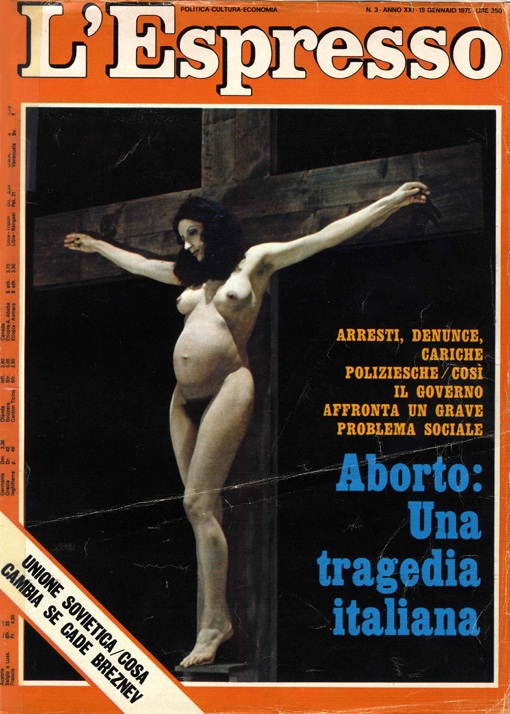 O vogliamo parlare della famosa copertina dell’Espresso contro gli aborti clandestini con la donna crocifissa, che provocò un incredibile scandalo all’epoca della sua pubblicazione e che segnò una precisa presa di posizione del settimanale a favore della legge sull’interruzione di gravidanza?